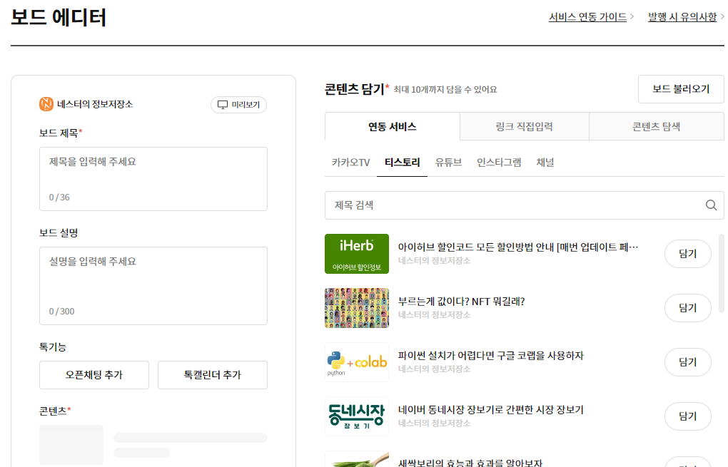 보드 메뉴를 선택하면 보드에디터화면을 통해서, 콘텐츠를 해당화면에서 직접 발행할 수 있습니다. 또한 티스토리 블로그나 유튜브, 인스타그램, 등에 연동해놓은 본인 채널에 콘텐츠를 담아서, 손쉽게 발행 할 수도 있습니다 한번ㅇ 보드를 발행할 떄 여러가지를 담아서 발행할 수도 있으며, 하나의 콘텐츠만 발행할 수도 있습니다. 보드 발행은 보드 발행하기 버튼을 눌러 발행할 수 있으며, 발행하면, 카카오톡창작센터 채널에서 톡알림이 옵니다