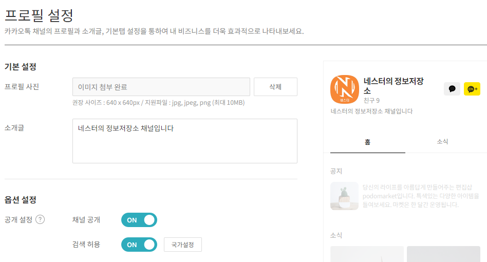 채널을 개설한 후 채널 관리자 센터에서 프로필설정에 들어준 후 설정해줘야 할 부분이 있습니다. 먼저 프로필 설정 부분에 채널공개, 검색허용을 모두 ON으로 변경하여줍니다 또한,탭설정에에서, 기본탭을 보드탭으로 설정하여 주고, 채널에서 보여질 정보들 중 어떤 항목들을 보여줄지 ON/OFF 할 수 있습니다. 카카오톡채널을 추가하면, 웰컴메시지가 발송될 수 있도록 메시지 설정을 메시지 > 웰컴메시지 메뉴에가서 추가하여줍니다.