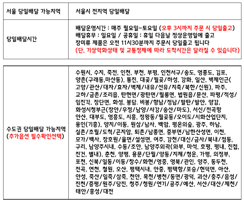 꽃배달은 일반 배송과다르게 꽃배달을 전문적으로하는 꽃배달 전문업체에서 배송을 진행합니다. 양재꽃시장 의 상품은 모두 전국으로 배송이 가능하지만, 현재는 서울과 수도권지역 및 일부 충청지역으로만 당일배송을 진행하고 있으며, 그 외지역은 추후 꽃배달전용택배로 배송하여드릴 예정입니다. 꽃배달은 제작과 배송하는 시간이 3~4시간의 소요시간이 발생하기 떄문에, 사전에 주문하시거나, 예약주문을 하시는것이 좋습니다.