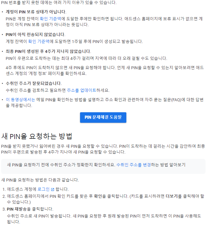 구글 애드센스 고객센터에 가서 검색해 보시면 구글 애드센스와 관련된 다양한 도움말을 확인 할 수 있습니다. 그리고 PIN번호 관련해서, 여러 가지 이유로 받지 못하거나, 새로운 핀번호를 요청해야 하는 상황도 발생하곤 합니다. 예를 들어 빨리 핀번호를 입력하고 싶은 마음에 기다림을 참지 못하고, 새로 핀번호를 신청했는데, 재신청 이후 이전에 신청한 핀번호가 떡하니 집에 도착하였다면, 이미 이전 핀번호는 사용이 안 되는 불상사가 발생합니다. 또 4주 기다리셔야 하는 상황이 발생한다는 거니, 침착하게 우편 올 때까지 느긋하게 기다려 주시면 됩니다.