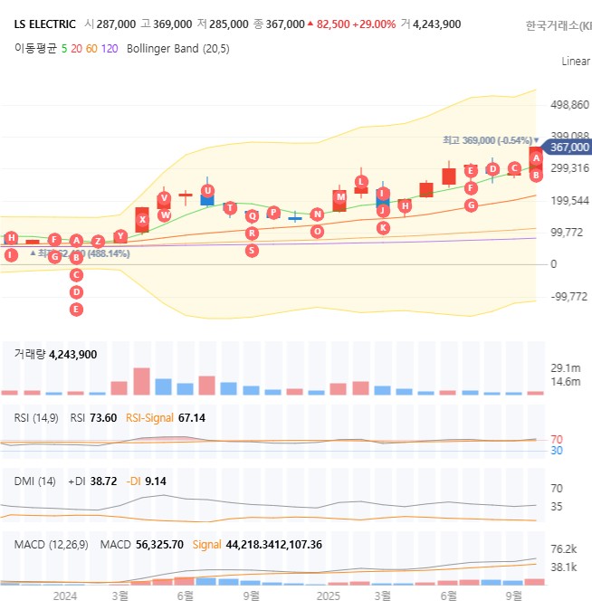 "자, 이제 가장 궁금해하실 차트를 볼 시간입니다. LS ELECTRIC의 현재 주가는 367,000원입니다. 다행히도 희망적인 신호들이 몇 가지 보이네요. 첫째, **이동평균선을 보면 5일, 20일, 60일선이 모두 정배열** 상태를 유지하며 강력한 상승 추세 속에 있습니다. 둘째, **MACD 지표는 56,325.70으로 여전히 Signal 선(44,218.34) 위에** 있으며, 추세의 힘이 살아있음을 보여줍니다. 셋째, 주가가 볼린저밴드 상단 부근에서 움직이며 강한 흐름을 지속하고 있습니다."