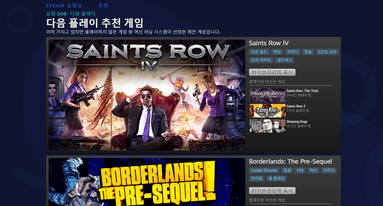 필자에게 추천해준 3개의 게임은 '세인츠로우 4' , '보더랜드 프리 시퀄' , '폴아웃 뉴 베가스' 이 3가지의 게임이었다. 당연히 설치조차 해보지 않은 게임들이었다, 보더랜드 프리 시퀄은 가지고 있는 줄도 몰랐다. 이렇게 유저들마다 각자 보유한 게임 중 성향에 맞는 게임 세 가지를 추천해주는 것이다. 이 추천된 3개의 게임이 마음에 들지 않는다면 다음 제안 보기라는 버튼을 눌러주면 또 다른 3개의 게임을 제안하여준다 하지만 이 시스템은 당연한 이야기겠지만, 라이브러리에 보유한 게임의 수가 적다면, 제한이 있을 수 있다.