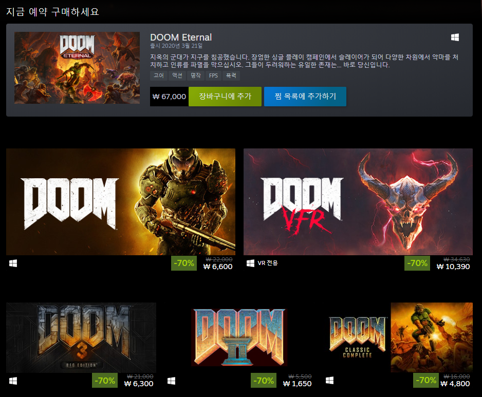 게이머라면 잘 알고 있을 게임 바로 둠이다. 1인칭 슈팅 게임의 시초라고 불리는 도스 시절에 한 번쯤 멀미와 함께 즐겨보았을 게임 울펜슈타인 3D 이후로 출시한 둠은 1993년 12월에 시리즈 최초의 작품이었고 이후 시리즈로 발매된 작품이다.