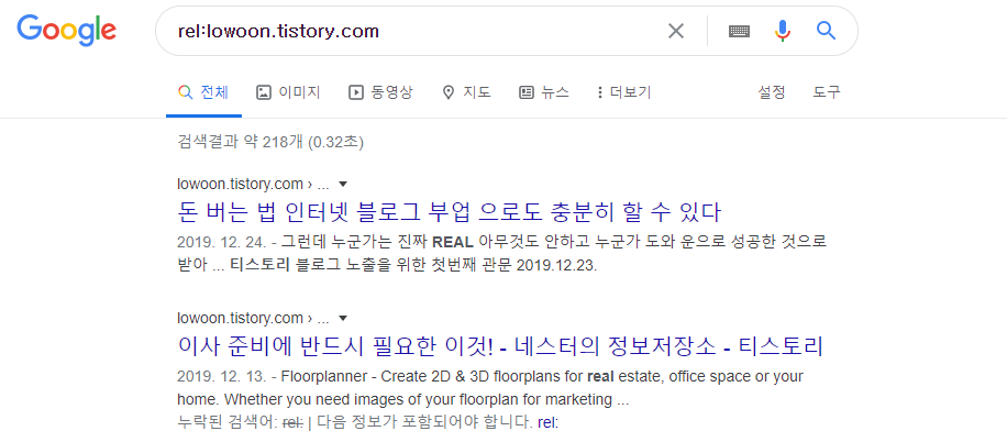 이 경우도 이전 내용과 같은 방식인데 이때에는 사이트 주소 앞에 rel: 을 넣어주면 된다 만일 위 이미지처럼 rel:lowoon.tistory.com이라고 검색을 하게 되면, 관련되었거나 관계된 사이트를 보여주는 기능이다. 사실 필자는 많이 사용하는 기능은 아니지만 가끔씩 필요할 때가 있다.