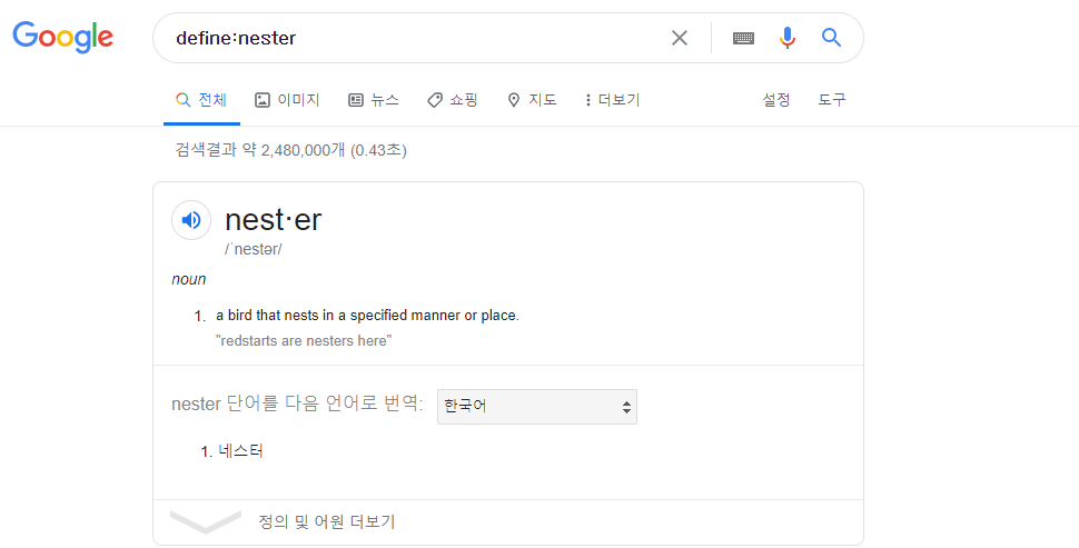 검색하는 방법에 따라 단어로만 검색하거나 문장으로 길게 검색하는 경우가 있는데, 이럴 때 반드시 포함되어야 하는 단어가 있다면 위 이미지 처럼 반드시 포함되어야 하는 단어에 큰 따옴표(")를 표기해 주도록 하자. 위 예시 처럼 "네스터"라는 검색을 하게 되면, 네스터라는 단어가 표시된 결과만을 검색 화면에 표시해주어 검색을 용이하게 활용할 수 있다.